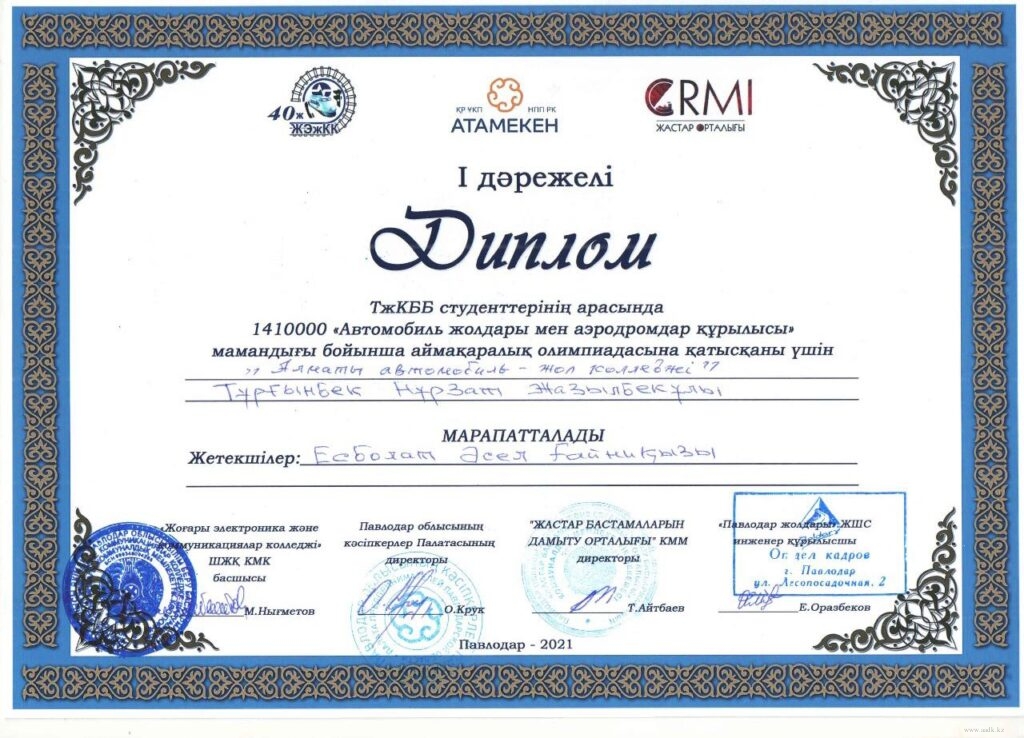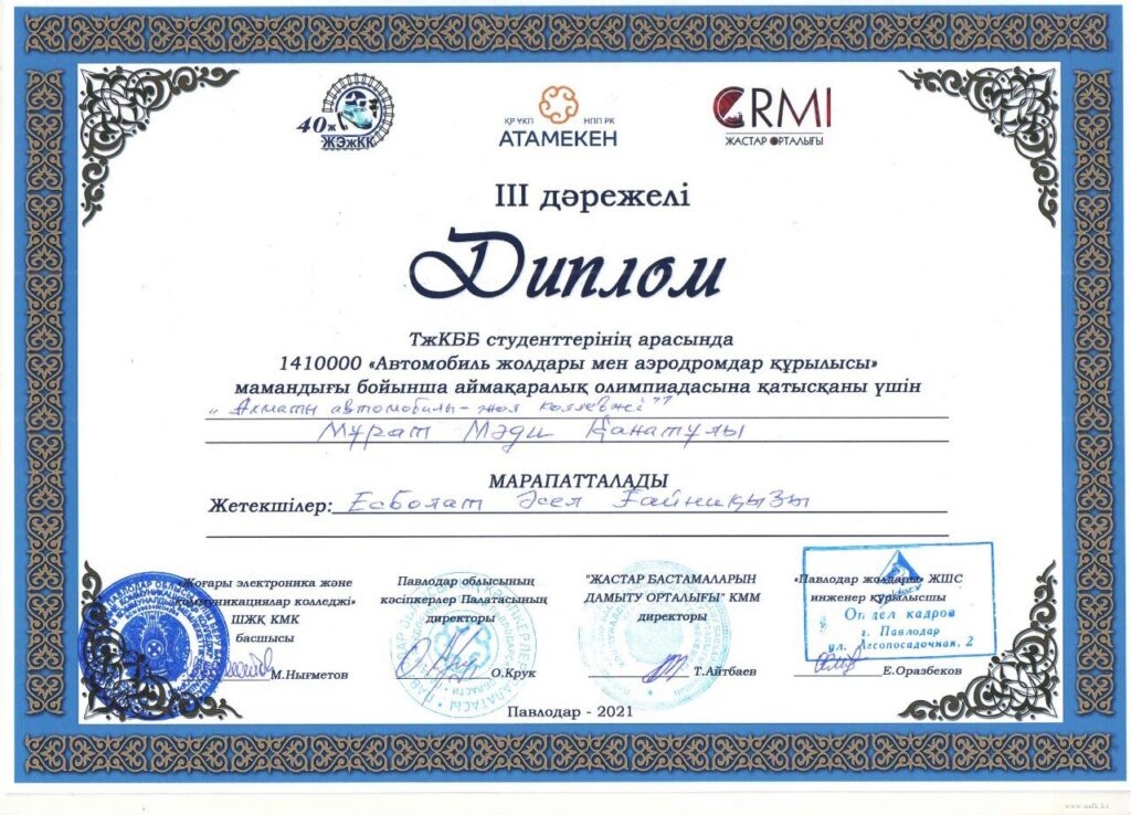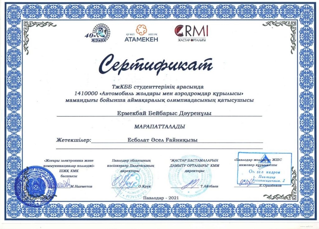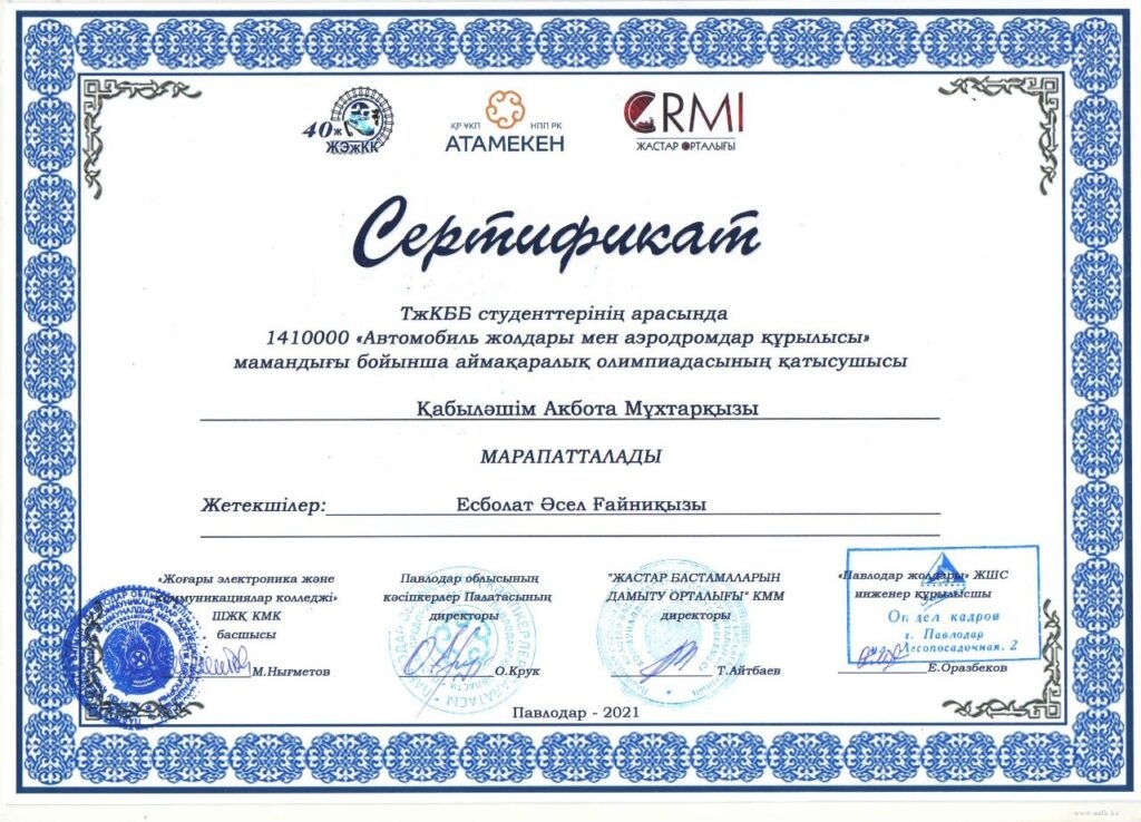А также Кабылашим Акбота и Ермекбай Бейбарыс получили сертификаты за участие в олимпиаде.