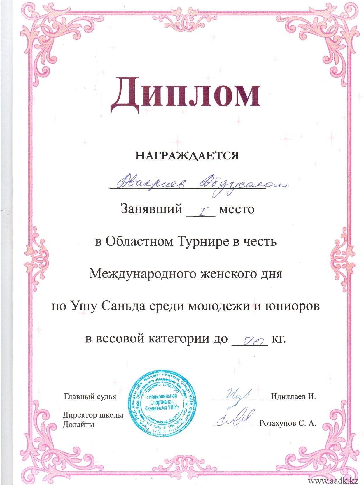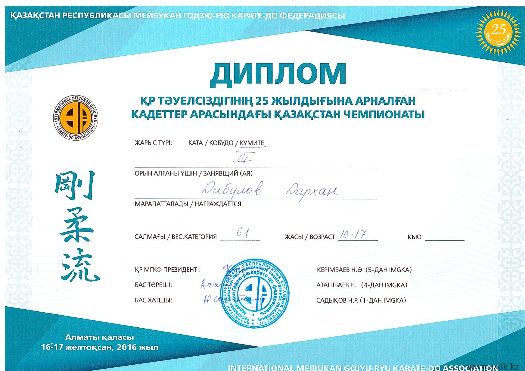 Администрация Алматинского автомобильно-дорожного колледжа поздравляет Дабулова Дархана, учащегося группы ДМ-16-20к, получивщего 3 место в весовой категории 61кг., по КУМИТЭ на чемпионате Казахстана между кадетов в рамках юбилея «25-летия Независимости Республики Казахстан». Желаем новых побед и не останавливаться на достигнутом!