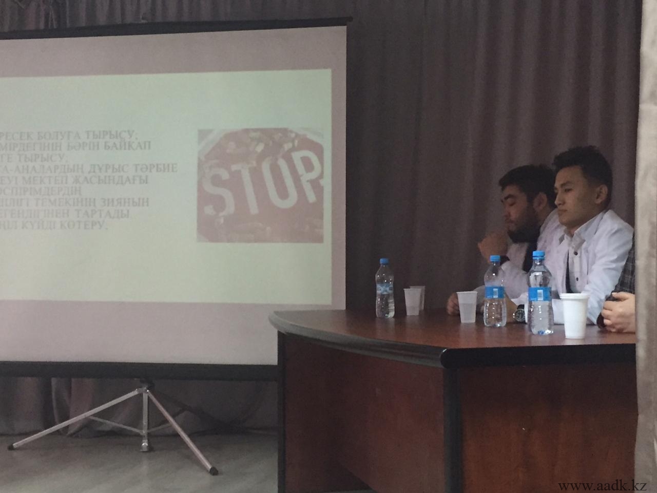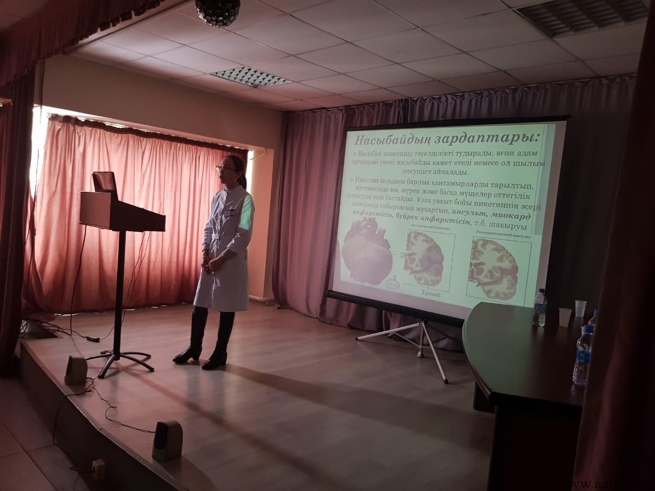 Жаңа өмір табалдырығын кеше ғана аттаған болашақтың тағдыры – оның денсаулығында. Дәріс барысында ұлы Абай атамыздың «Бес нәрсеге ғашық бол, бес нәрседен қашық бол» қағидасы берік ұсталынып, қазіргі жастарымыздың жаман әдеттерден яғни темекі, насыбай, ішімдік сияқты нәрселерден аулақ болулары үшін олардың зиянды жақтарын толық қанды ашып түсіндірді . Белсенді оқушыларымыз да өз ойларымен бөлісіп кеткенді жөн көрді.