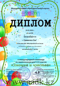 20.05.2020 г. учащаяся 1 курса Грищенко Ева участвовала в международной олимпиаде по самопазнанию «Эмоции и чувсвта» под руководством Нурбаевой Алии Адильхановны и заняла ІІ место. Поздравляем Вас и желаем творческих успехов!