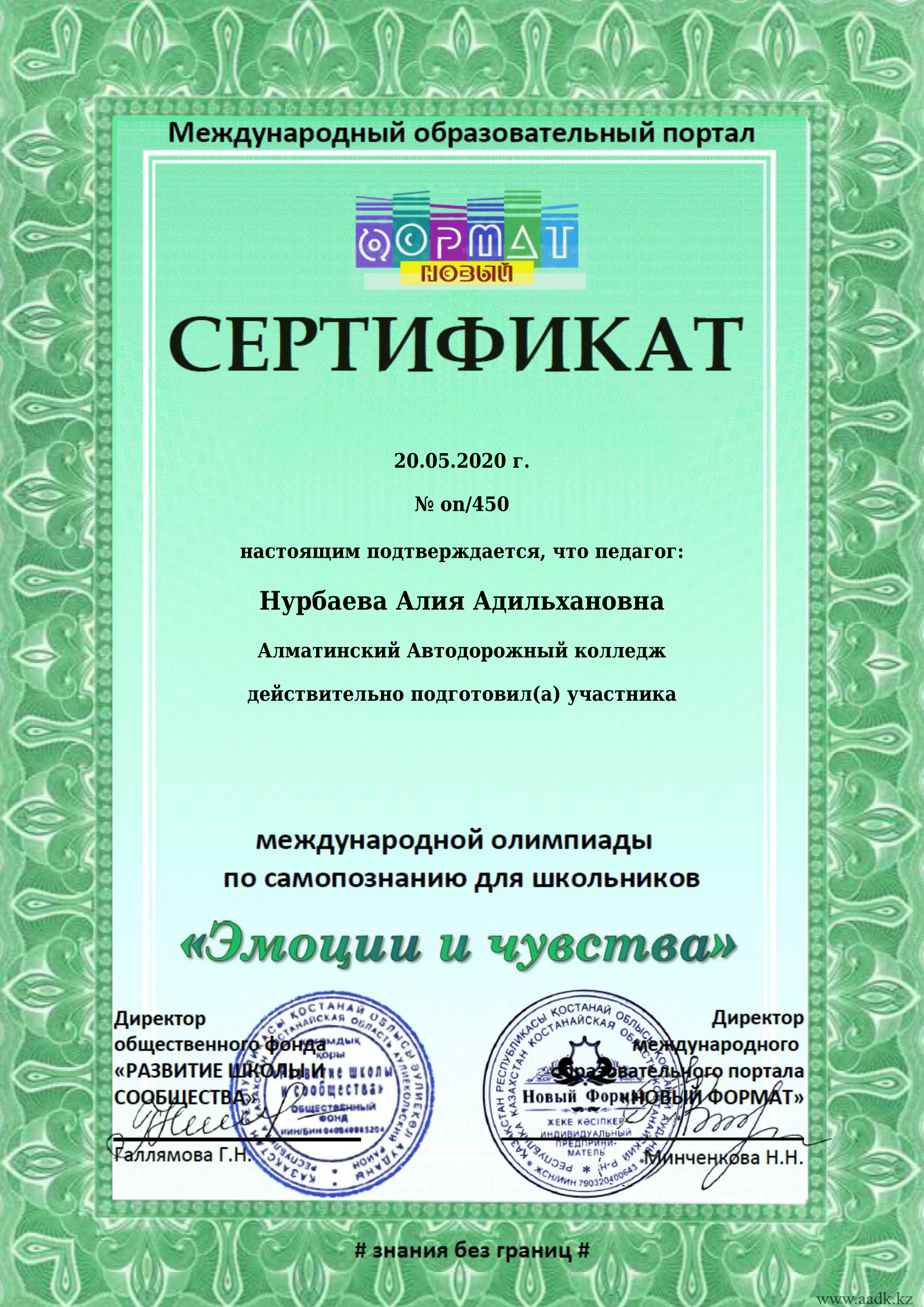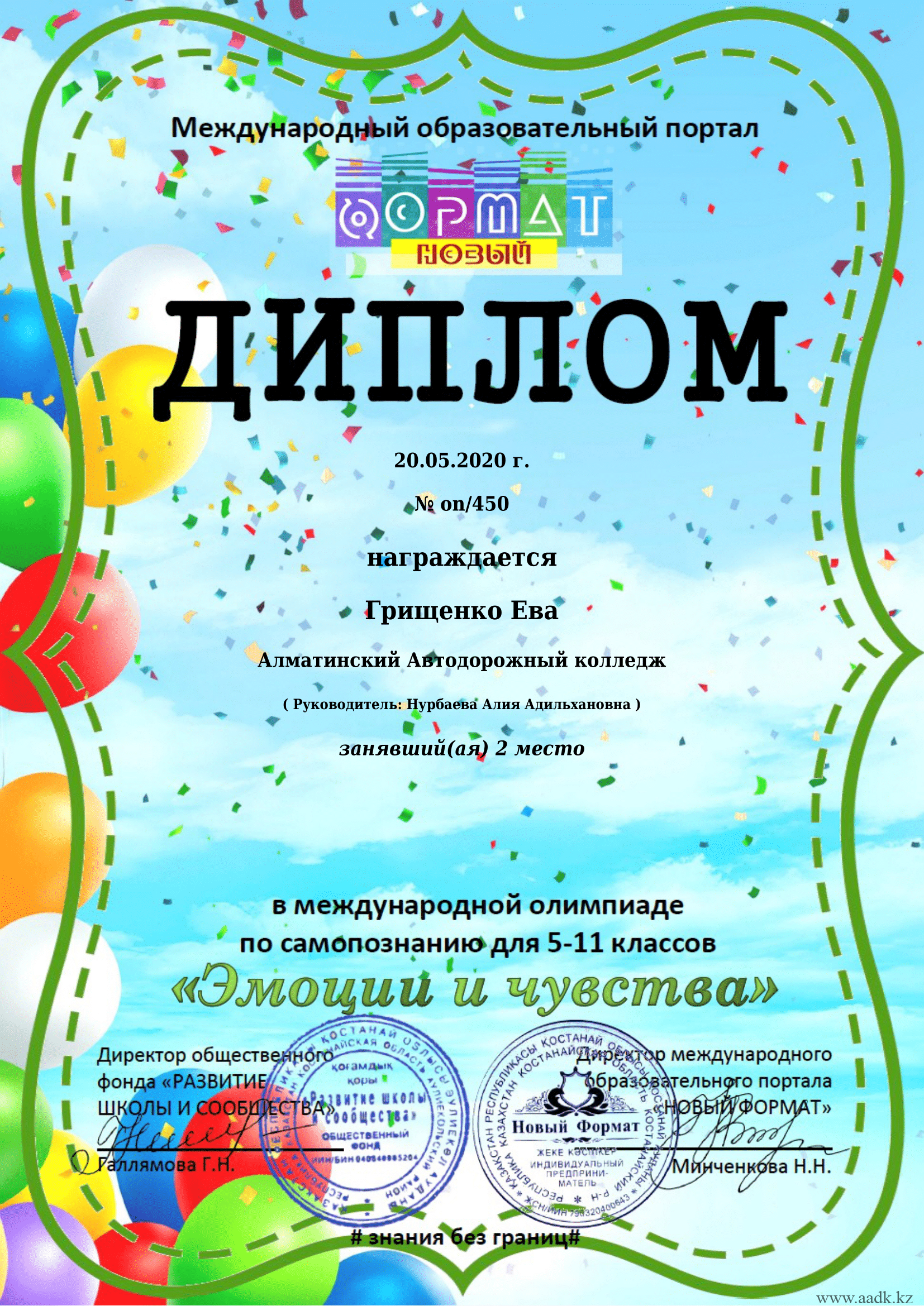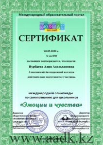 20.05.2020 г. учащаяся 1 курса Грищенко Ева участвовала в международной олимпиаде по самопазнанию «Эмоции и чувсвта» под руководством Нурбаевой Алии Адильхановны и заняла ІІ место. Поздравляем Вас и желаем творческих успехов!