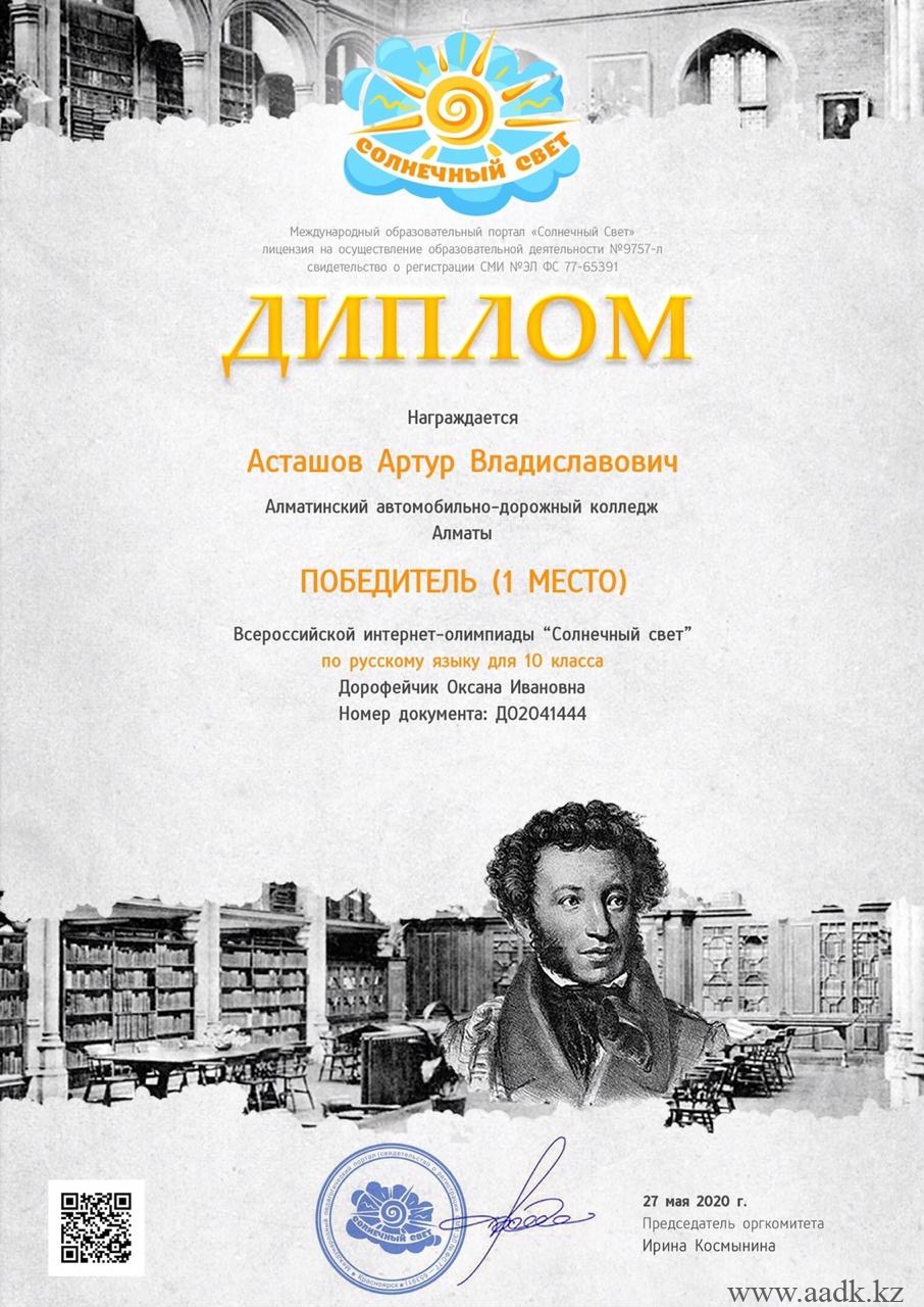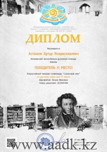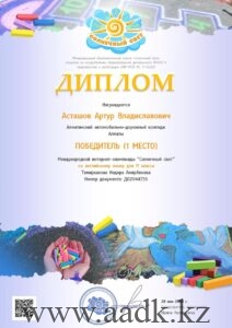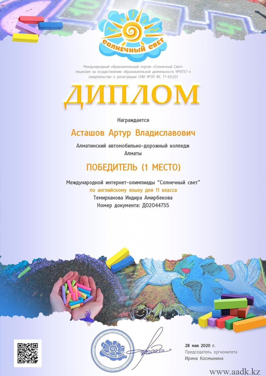 3. Асташов Артур занял І место по английскому языку. Руководитель Темирханова Индира Амирбековна.