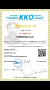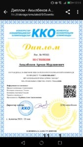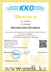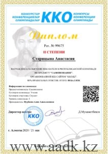 - Старицына Анастасия заняла І место по предмету «Казахский язык» под руководством Аянбековой Назиры Имашевны.