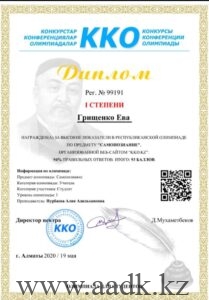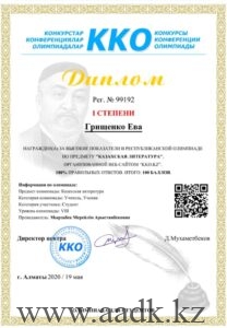 - Грищенко Ева заняла І место по предмету «Казахский язык» под руководством Мырзабек Мерейлім Арыстанбековны.