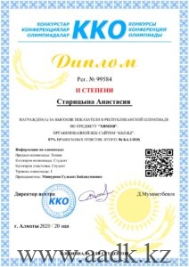 - Старицына Анастасия заняла ІІ место по предмету «Химия» под руководством Машуровой Гульназа Байджумаевны.