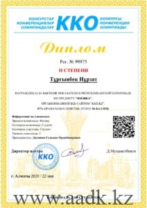 - Тұрғынбек Нұрзат занял ІІ место по предмету «Физика» под руководством Дауеновой Гульжана Орынбасаровны.