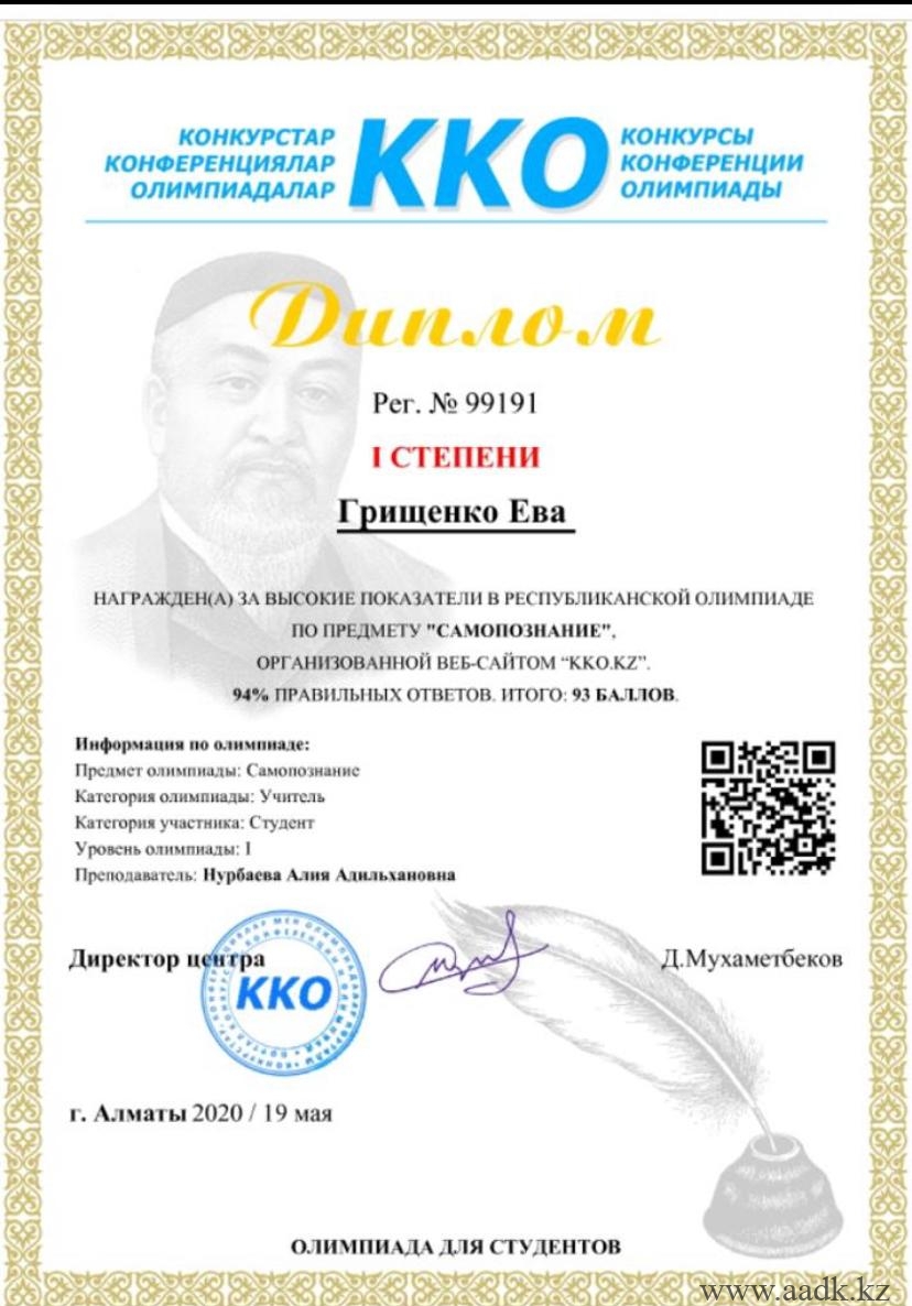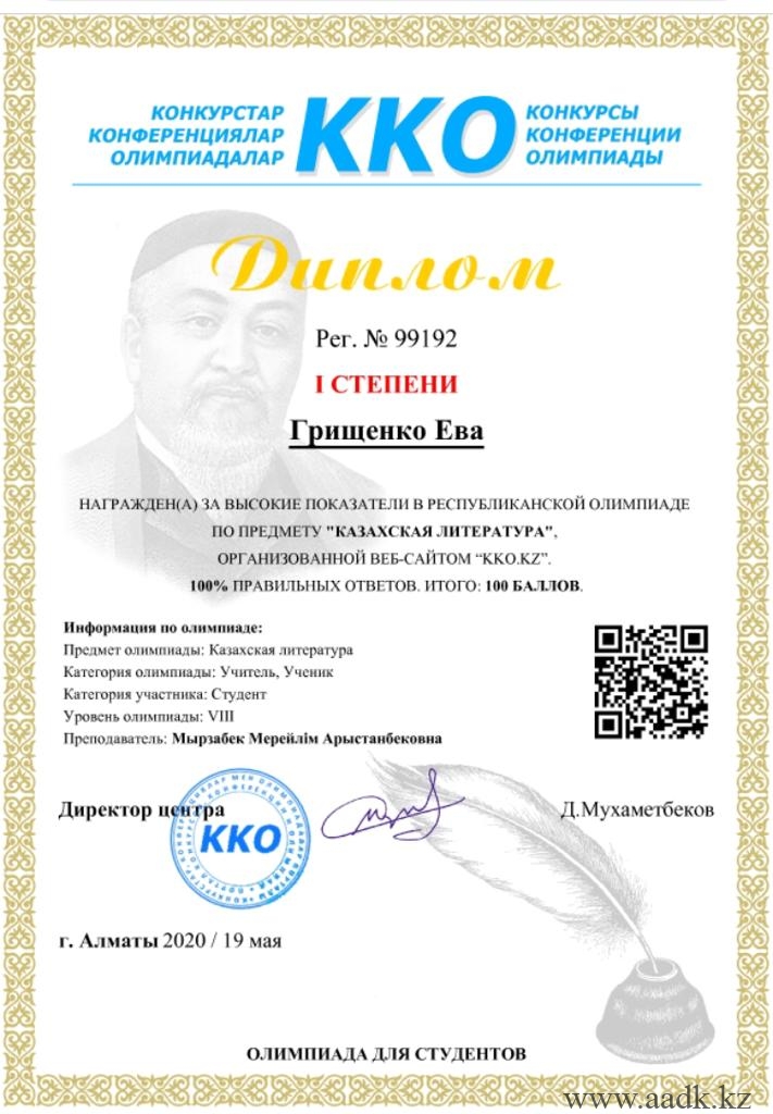 - Грищенко Ева заняла І место по предмету «Казахский язык» под руководством Мырзабек Мерейлім Арыстанбековны.