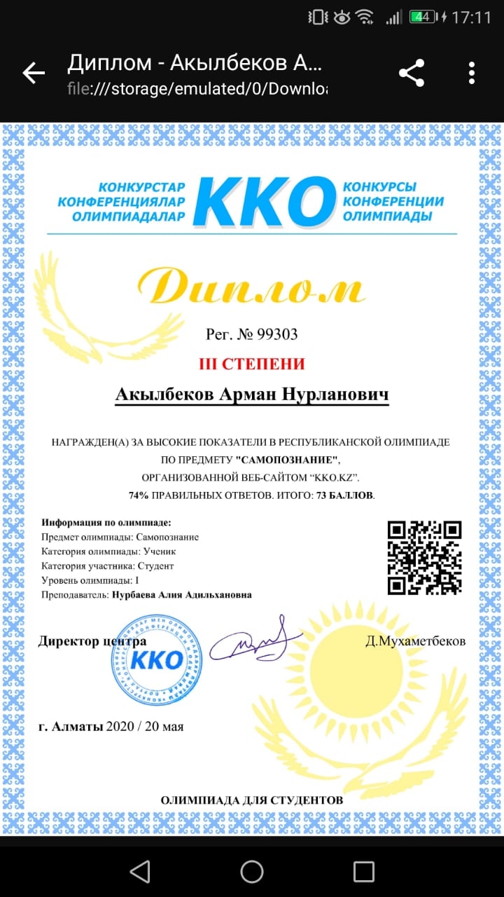 - Акылбеков Арман занял ІІІ место по предмету «Самопознание» под