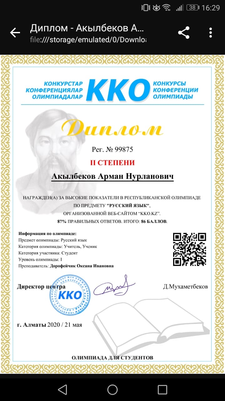 - Акылбеков Арман занял ІІ место по предмету «Руский язык» под