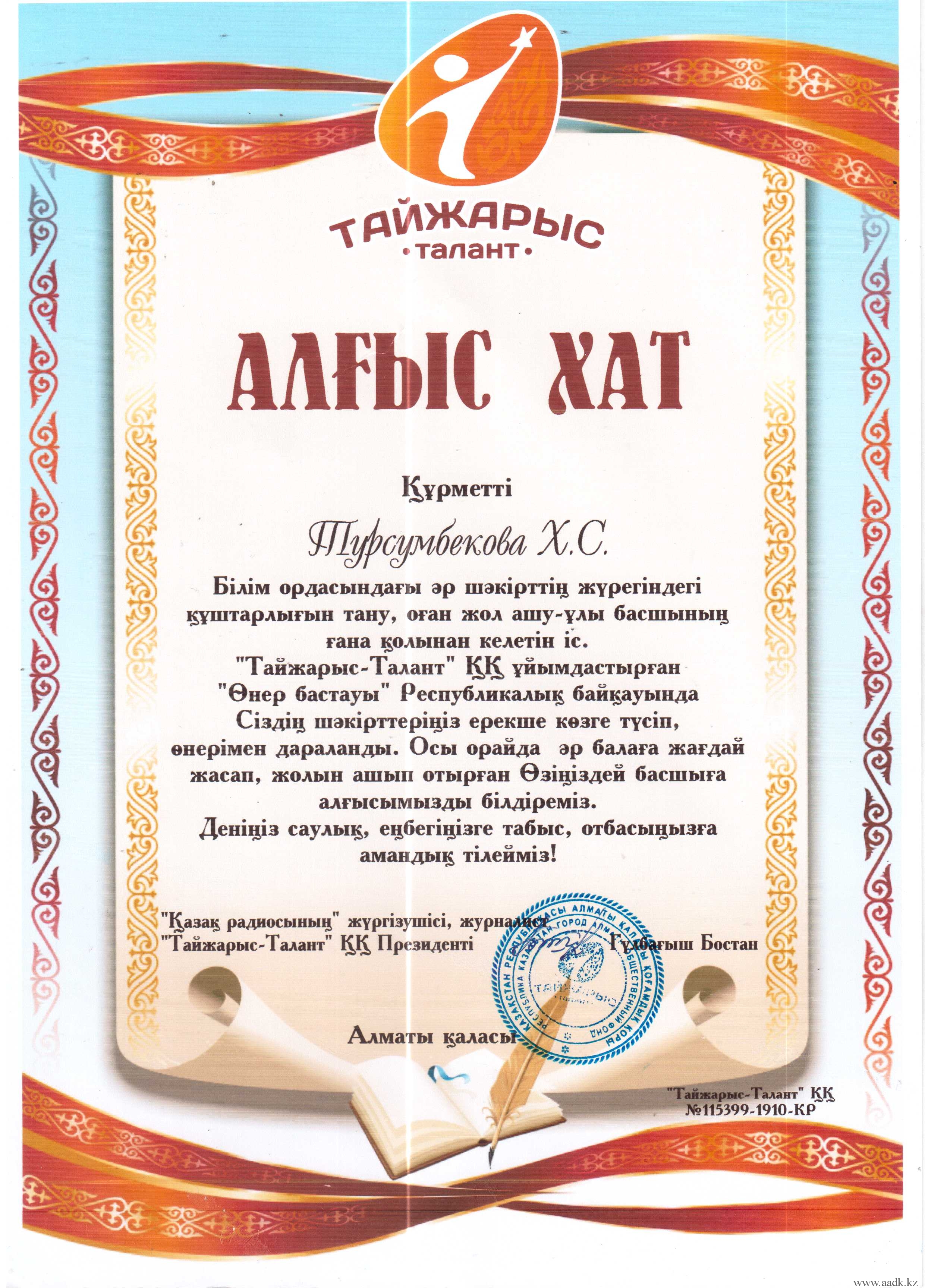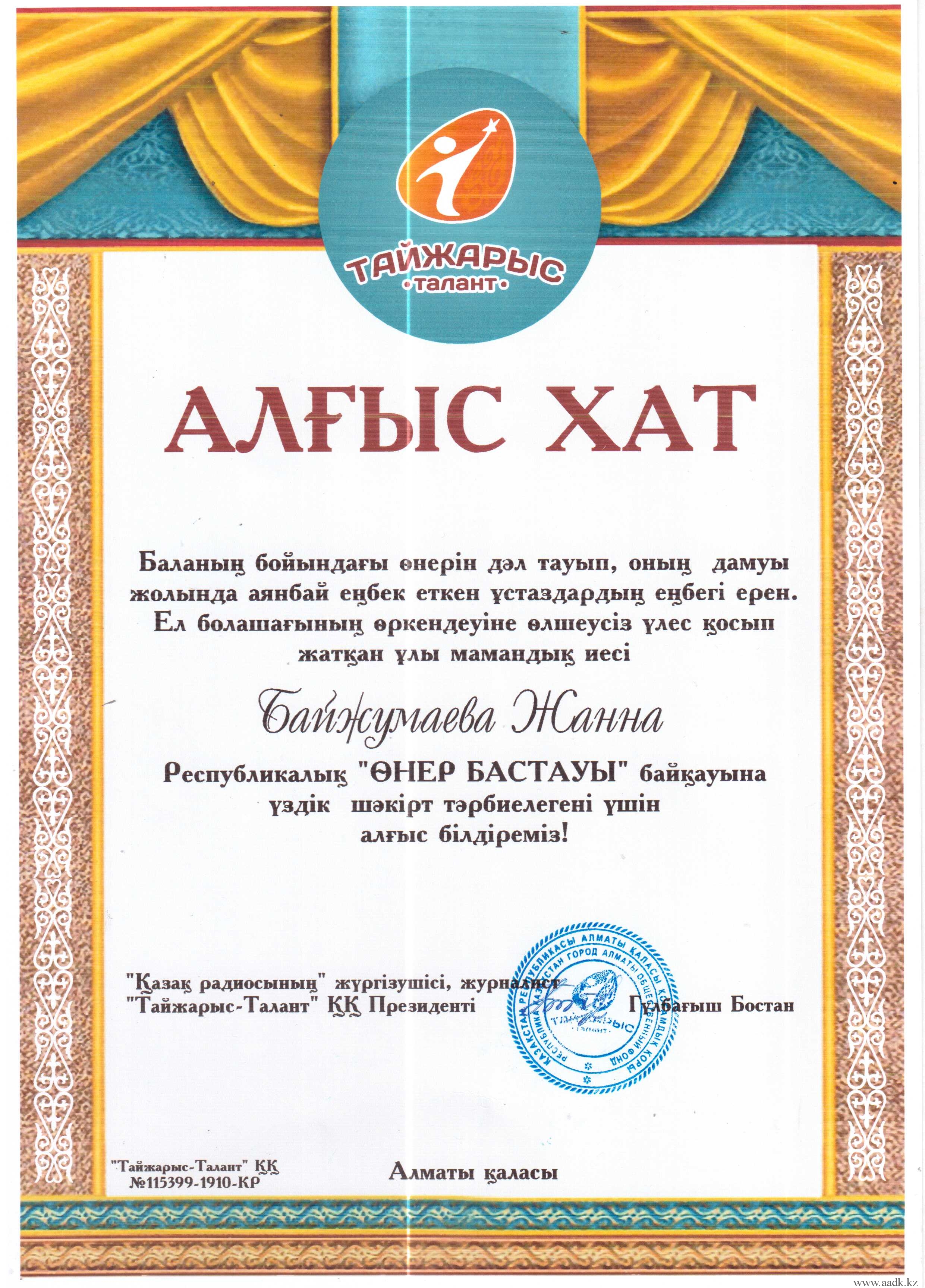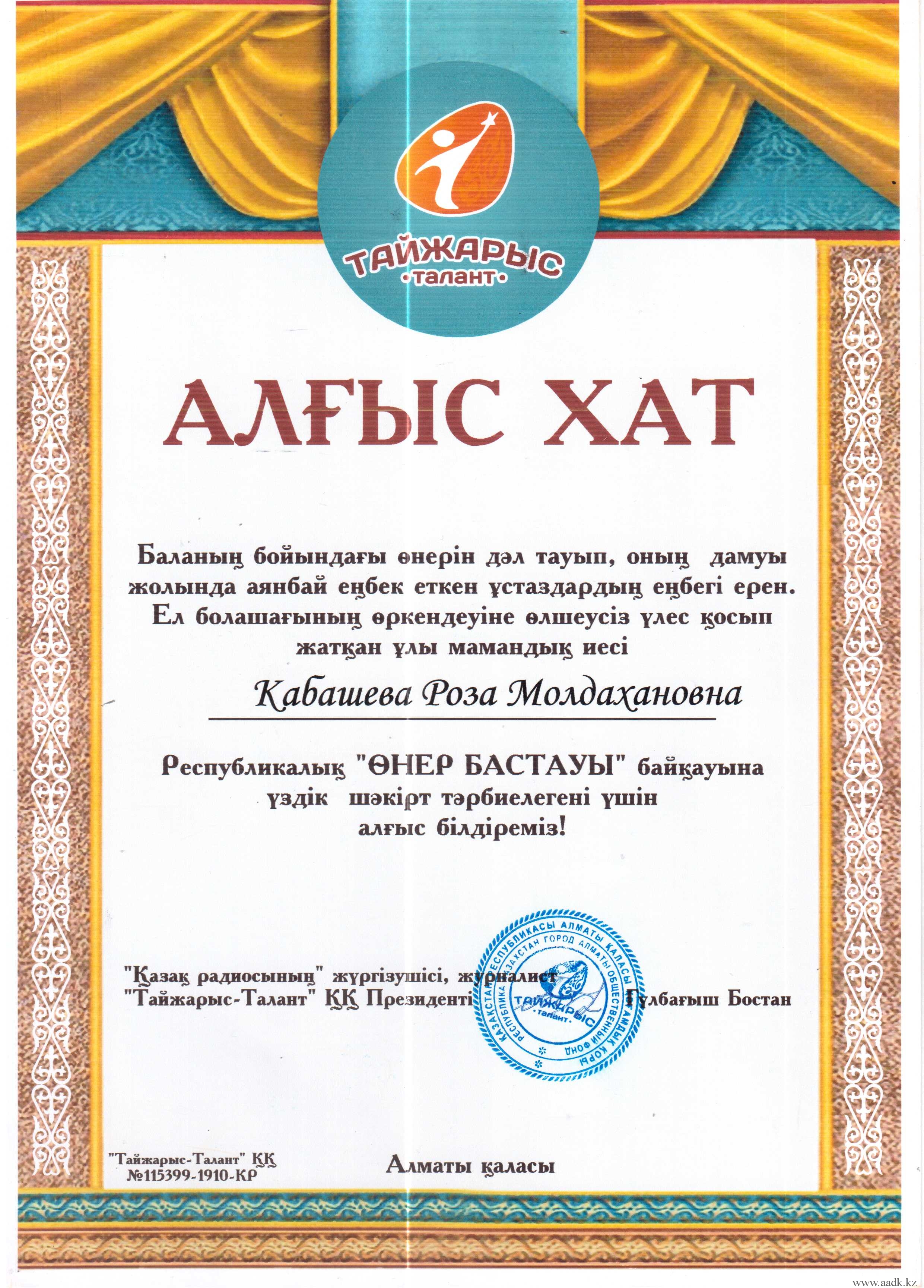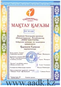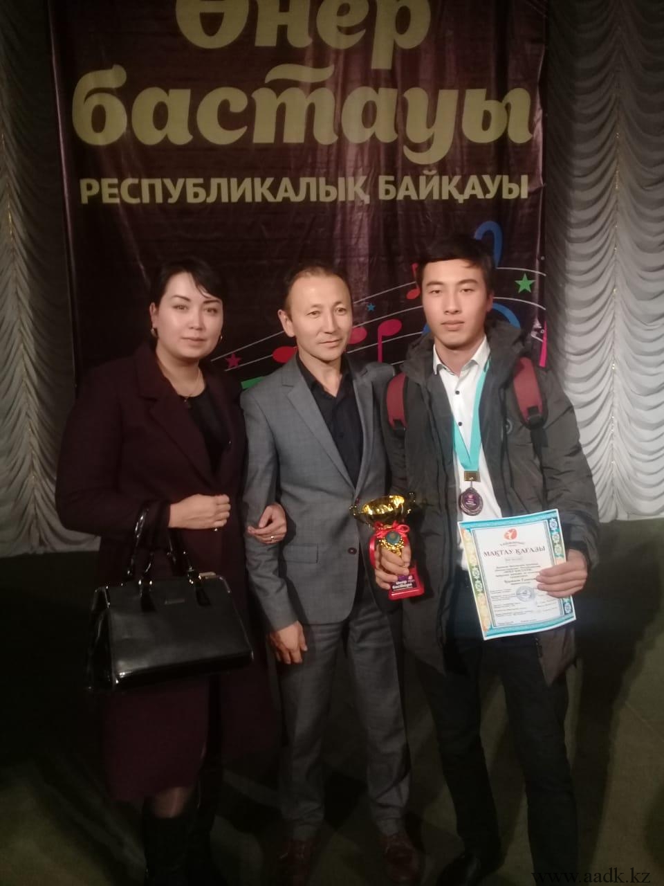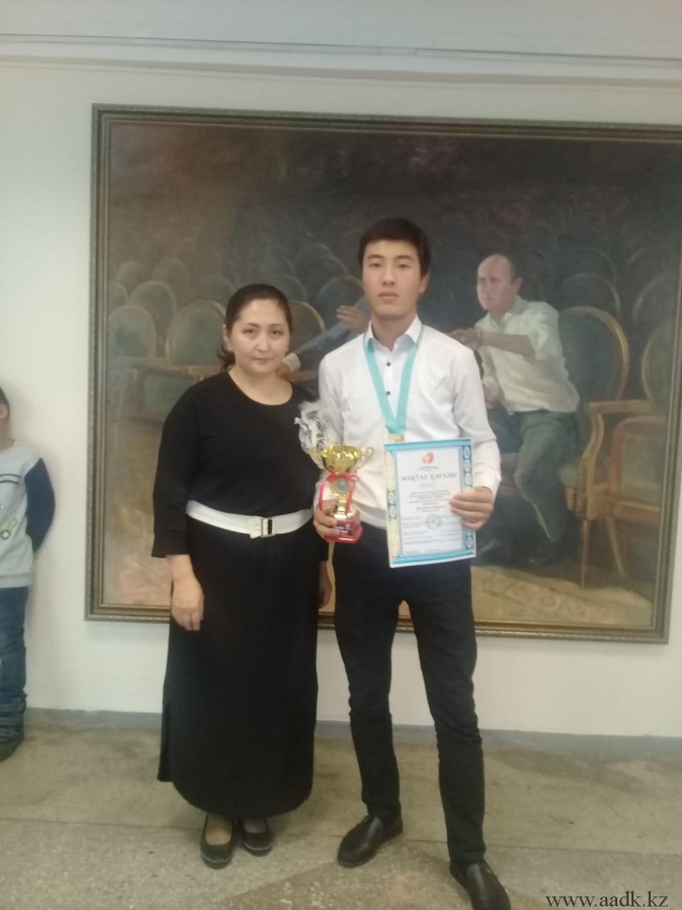 Админстрация Алматинского автомобильно-дорожного колледжа поздравляет учащегося группы ОП-17-21К Ермұхан Қаржау, занявшего Гранпри в республиканском конкурсе «Өнер бастауы» . Руководителем учящегося была преподаватель казахского языка и литературы Байжумаева Жанна Куандыковна. Ей было вручено благодарственное письмо за то, что она открыла в своем ученике творческий талант и помогла в развитии его способностей. Так же от АО «Тайжарыс-Талант» были вручены благодарственные письма руководителям колледжа Кабашевой Розе Молдахановне, Турсумбековой Хорлан Сакеновне.