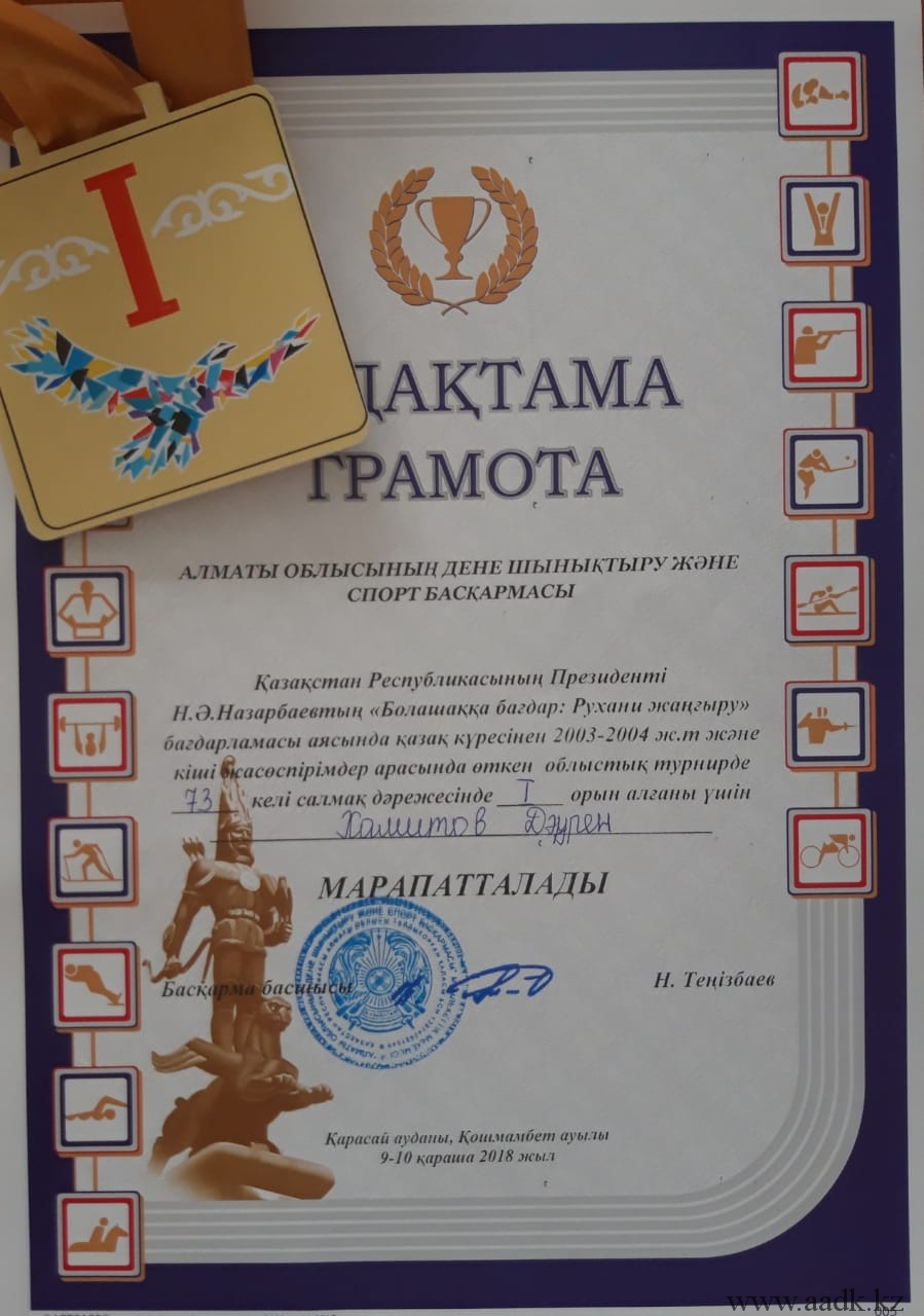 Учащийся группы САД-18-22К Хамитов Даурен, занявшего 1 место в весовой категории 73 кг в областном турнире по «Қазақ күресі» также наградили Грамотой за победу