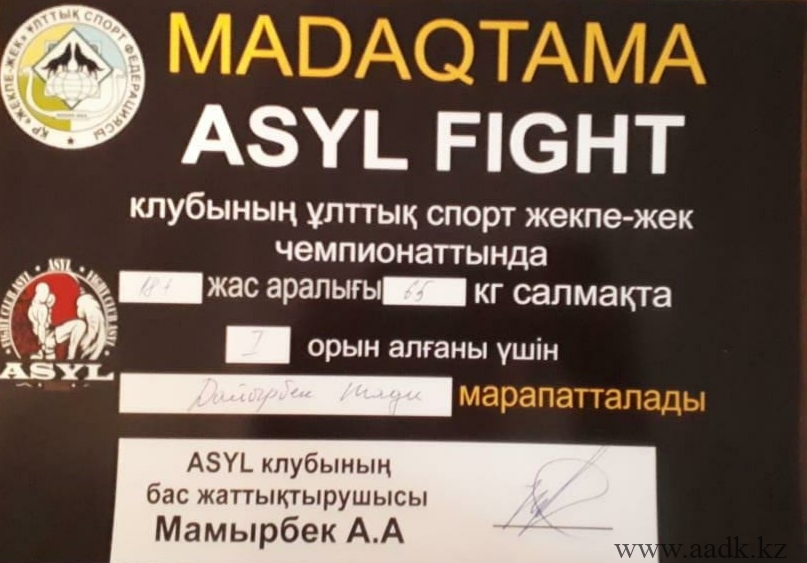 Құттықтаймыз! 4 курс оқушысы Дайырбек Мади «Asyl Figth» клубының ұлттық спорт және жеке-жек чемпинонатында 65 кг салмақта І орынды иеленді.