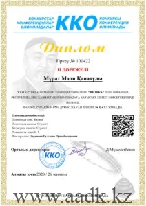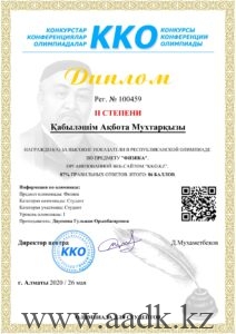 1.Қабыләшім Ақбота физика пәні бойынша ІІ орынға ие болды. Жетекшісі — Дауенова Гульжан Орынбасаровна.