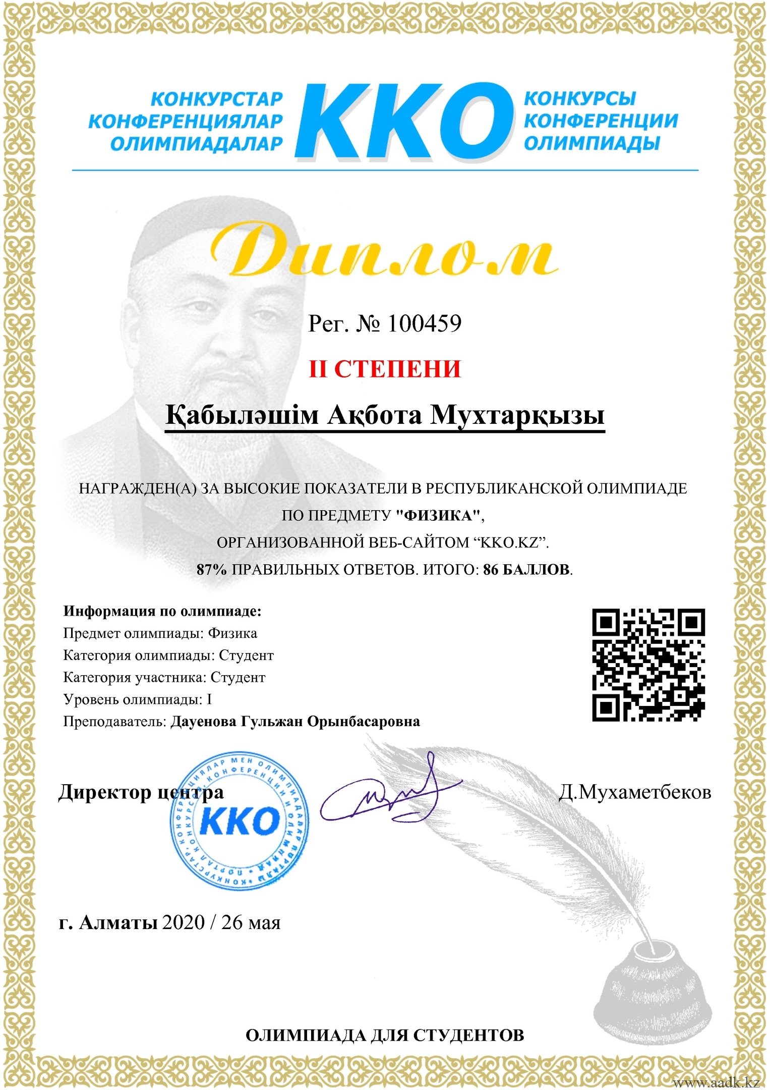 25.05.2020 — 29.05.2020 аралығындағы ККО.KZ веб-порталының ұйымдастыруымен өткен онлайн олимпиада нәтижесі бойынша: