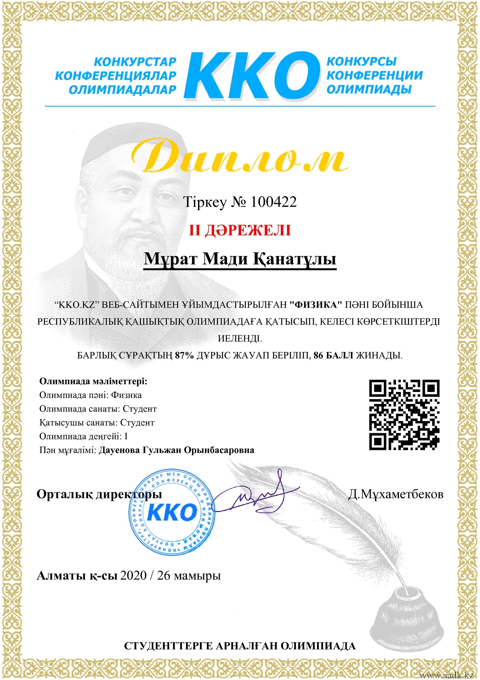 2. Мұрат Мади физика пәні бойынша ІІ орынға ие болды.