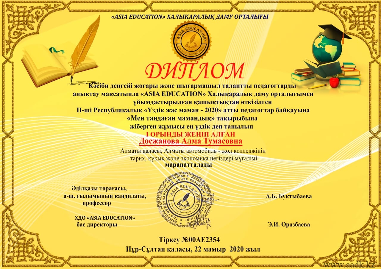 22.05.2020 күні кәсіби деңгейі жоғары және шығармашыл талантты педагогтарды анықтау мақсатында «ASIA EDUCATION» Халықаралық даму орталығымен ұйымдастырылған қашықтықтан өткізілген ІІ-ші Республикалық «Үздік маман -2020» атты педагогтар байқауы өткен болатын. Бұл байқауға колледжіміздің атынан тарих, құқық және экономика пәндерінің оқытушысы Досжанова Алма Тумасовна өзінің  «Мен таңдаған мамандық» тақырыбындағы жұмысымен қатысты және бұл жұмыс  ең үздік деп  танылып І орынды жеңіп алды.