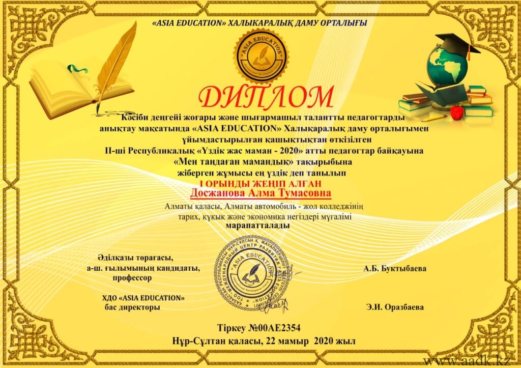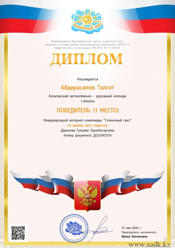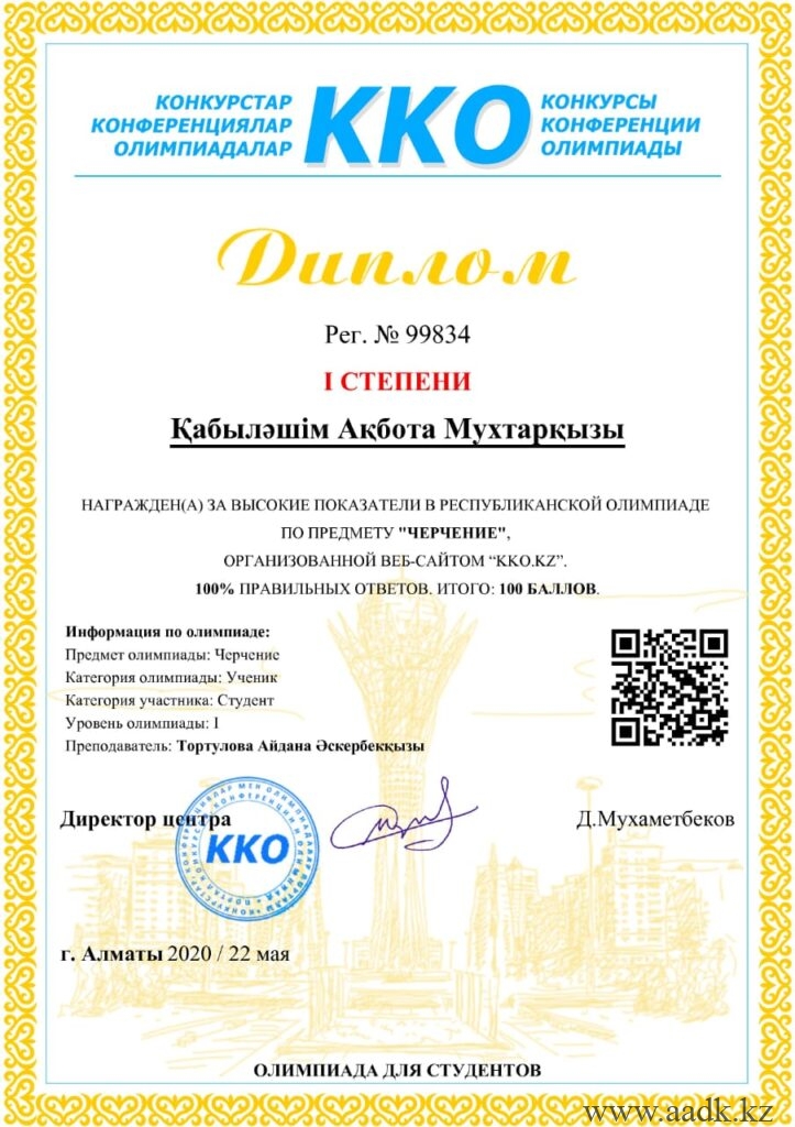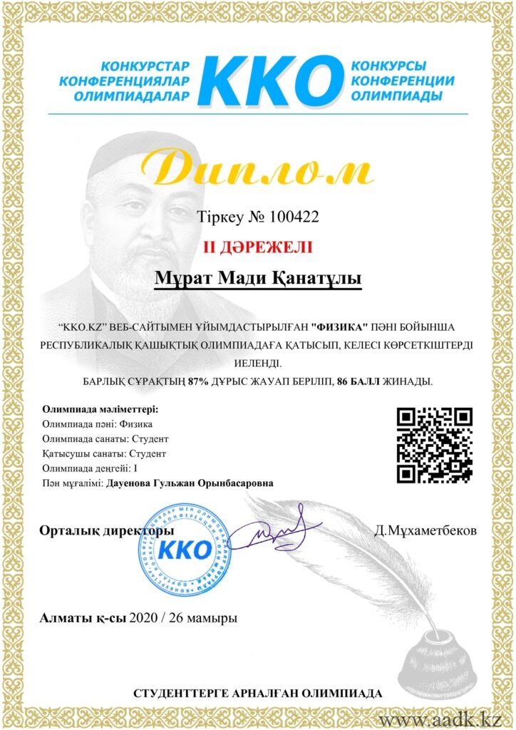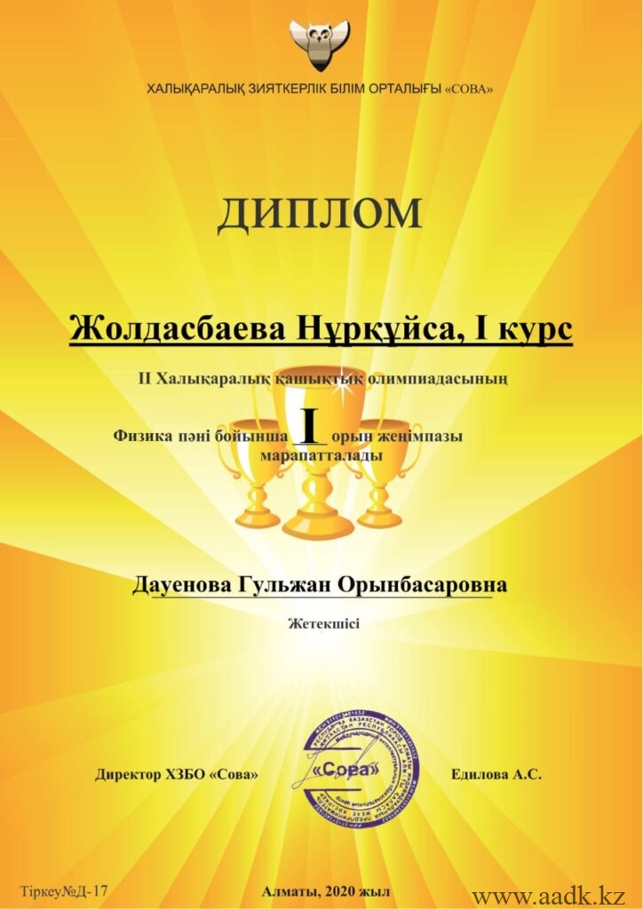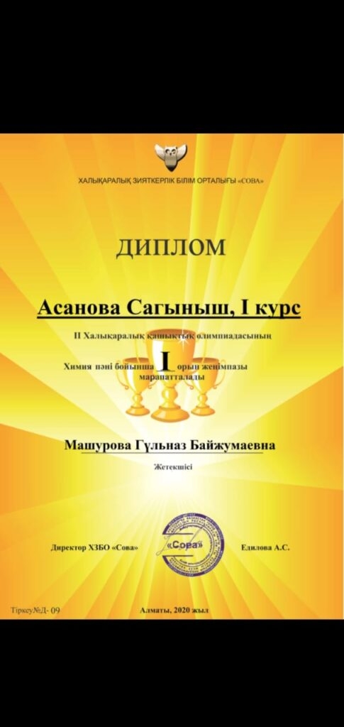 «Сова»зияткерлік білім орталығы ұйымдастырған ІІ Халықаралық онлайн олимпиадасына қатысып, жүлделі орынға ие болған оқушыларымызды құттықтаймыз: 1. Арап Гүлжайна физика пәні бойынша І орынға ие болды.Жетекшісі — Дауенова Гульжан Орынбасаровна. 2. Асанова Сағыныш химия пәні бойынша І орынға ие болды. Жетекшісі Читать дальше …
